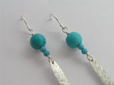 Light and delicate earrings, with an elongated feather that I cut from a sterling silver sheet, and three turquoise beads, hanging from a handmade sterling silver ear wire.